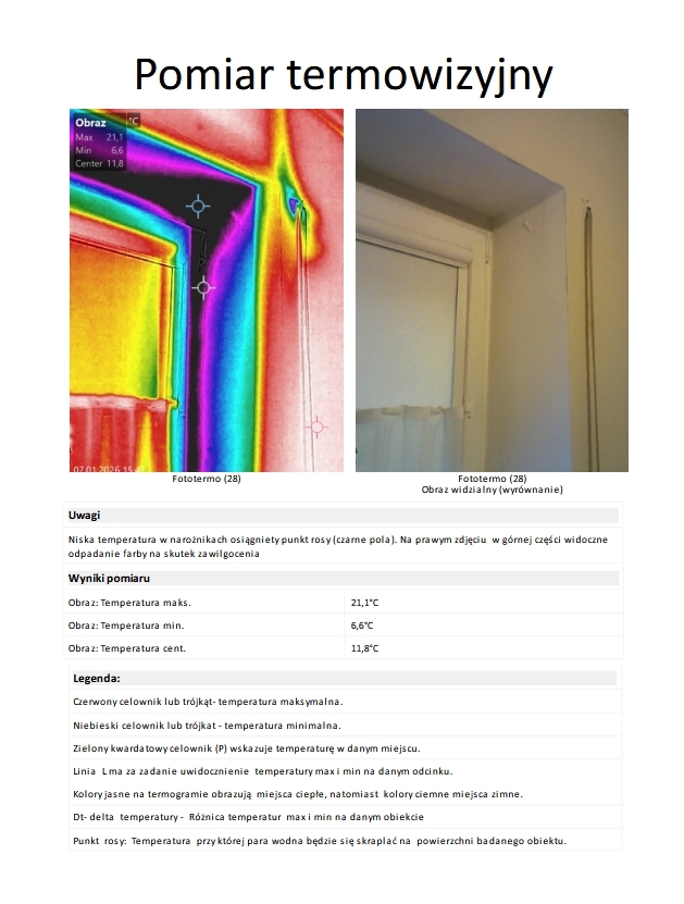 Poniżej przykładowa strona raportu termowizyjnego opisującego wadę budowlaną w postaci niewłaściwej izolacji okna co jest widoczne na zdjęciu termowizyjnym wyznaczającym punkty rosy. Wszystkie obszary koloru czarnego przekroczyły punkt rosy co będzie skutkować skraplaniem się pary wodnej i stworzy dogodne warunki do rozwoju grzybów i pleśni.